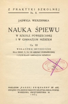 Title: Nauka śpiewu w szkole powszechnej i w gimnazjum niższem. Cz. 3, Wskazówki metodyczne dla oddz. V, VI, VII szkoły powszechnej i I, II, III klasy gimnazjum niższego